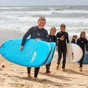 Thick wetsuits that keep you warm and softtop surfboards that are not just fun to surf but also perfectly save and designed especially for surf lessons.