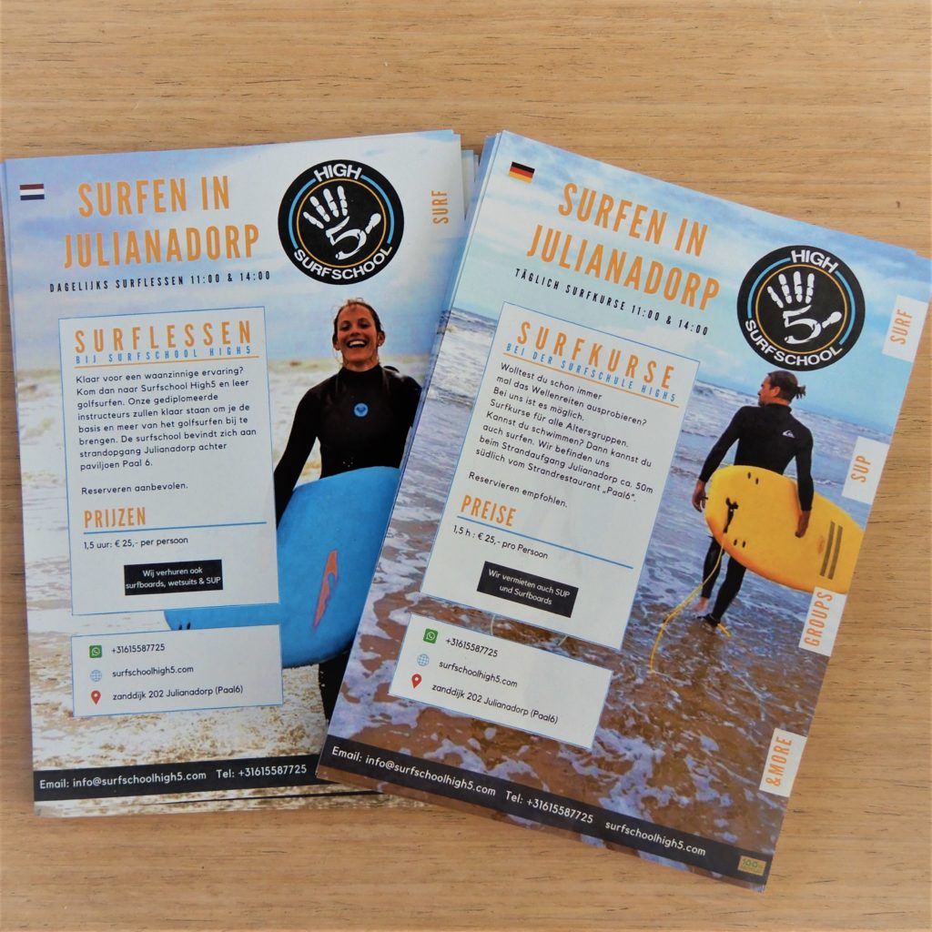 Klaar voor een waanzinnige ervaring? Kom dan naar Surfschool High5 en leer golfsurfen. Onze gediplomeerde instructeurs zullen klaar staan om je de basis en meer van het golfsurfen bij te brengen. De surfschool bevindt zich aan strandopgang Julianadorp achter paviljoen Paal 6.