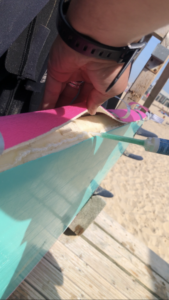 Ontdek het Verschil: Bij Surfschool High5 gebruiken we de nieuwste technologie voor softtop surfboard reparaties van MrGlue. Deze speciaal samengestelde snel drogende lijm, droogt binnen enkele minuten en je surfboard kan je al minder dan 24uur weer gebruiken!